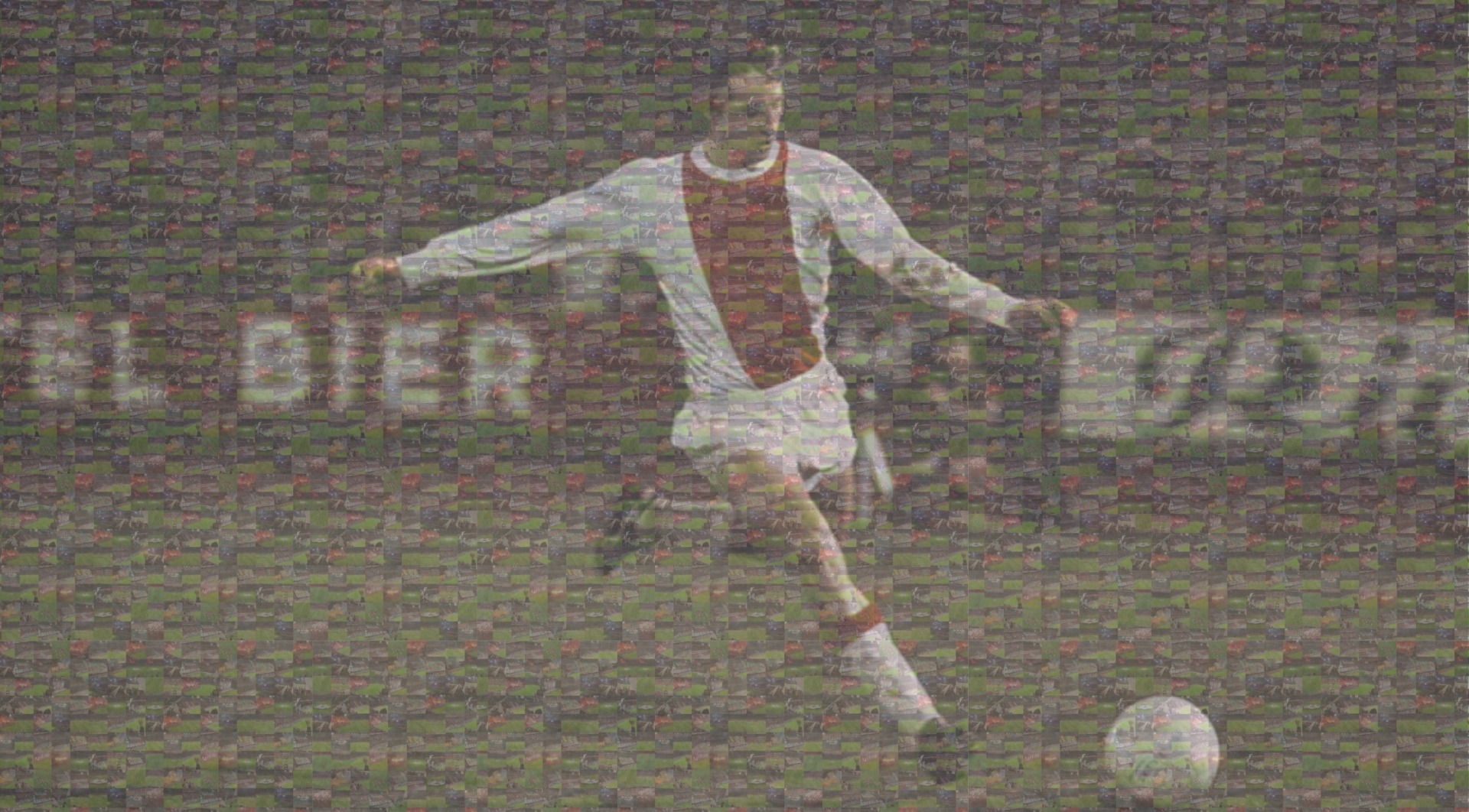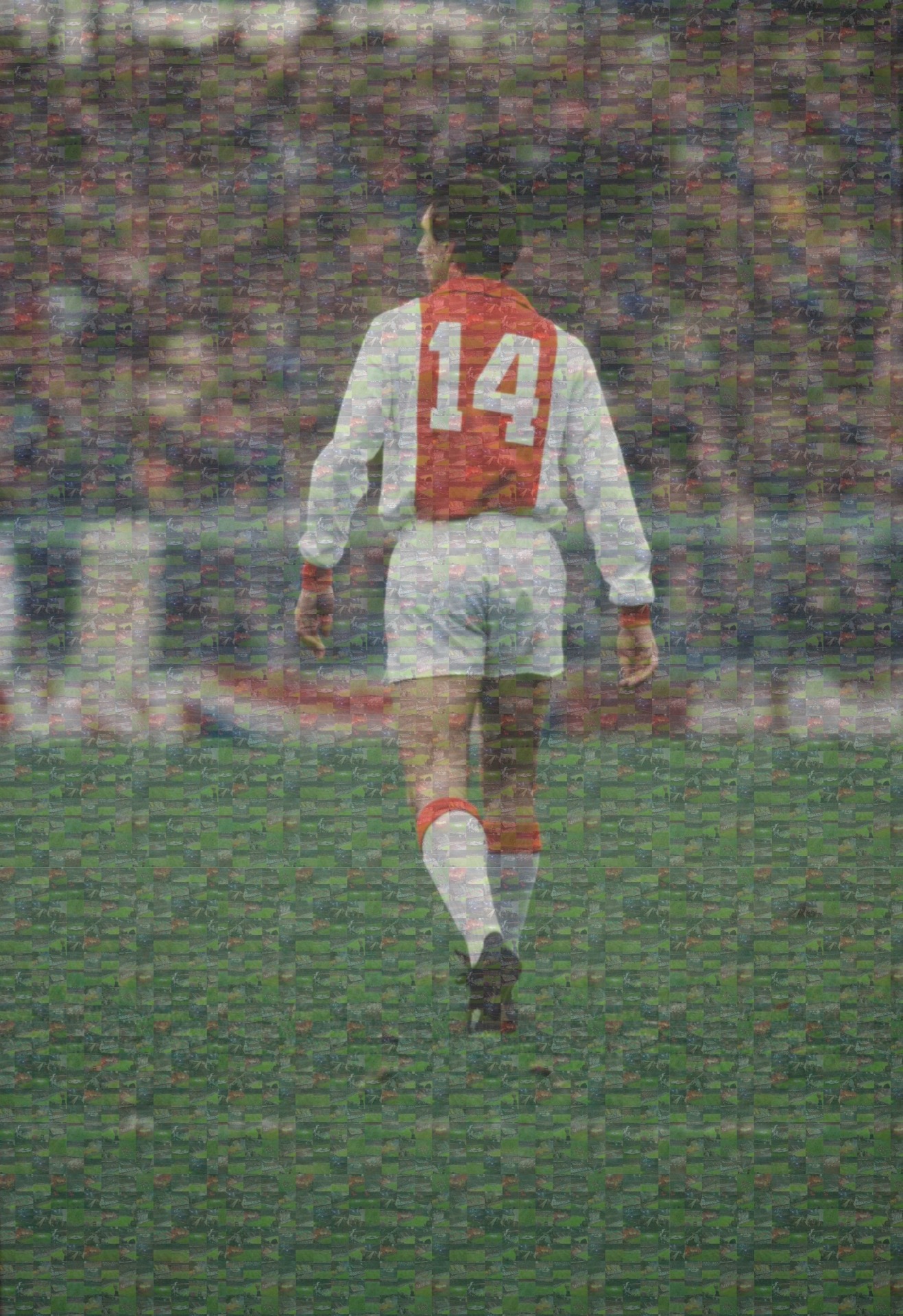 Om de honderden kleine afbeeldingen als het ware meer uit te laten poppen en het meer overeen te laten komen met de foto's van Johan Cruijff, heb ik een soort grijze vlak over de afbeeldingen heen gezet met een opacity van 50. Nu kan ik de allerlaatste stap zetten en dat is de foto van Johan Cruijff over de mozaïekjes te plaatsen met dezelfde opacity van 50, en dat leverde deze resultaten op van mijn afbeeldingen.