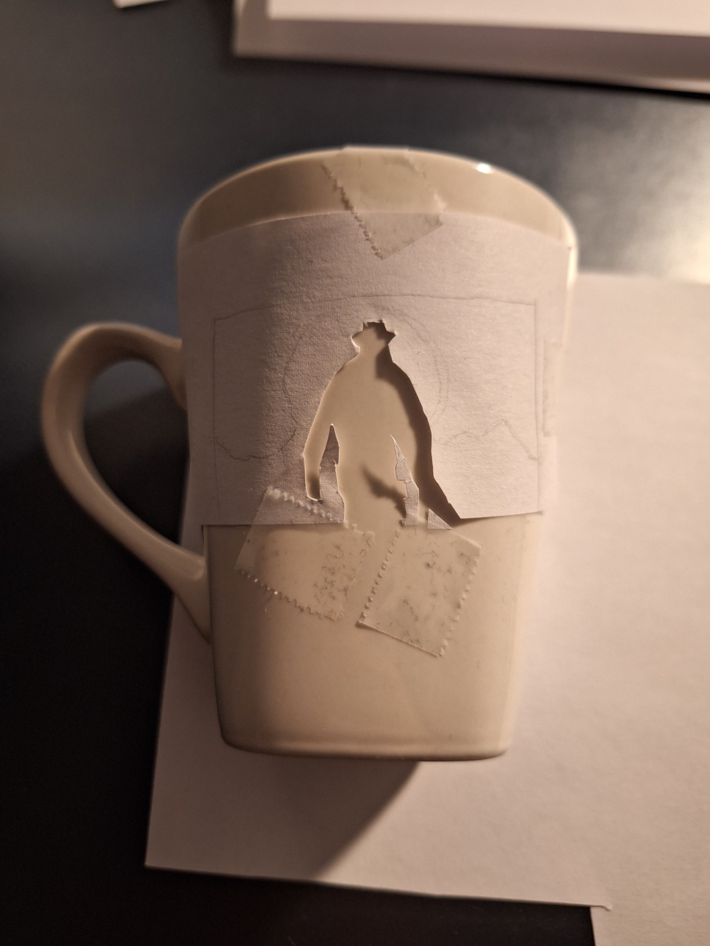 - Teken het figuur en knip de binnenkant uit om zo een vel te krijgen om op de mok over te kleuren.
